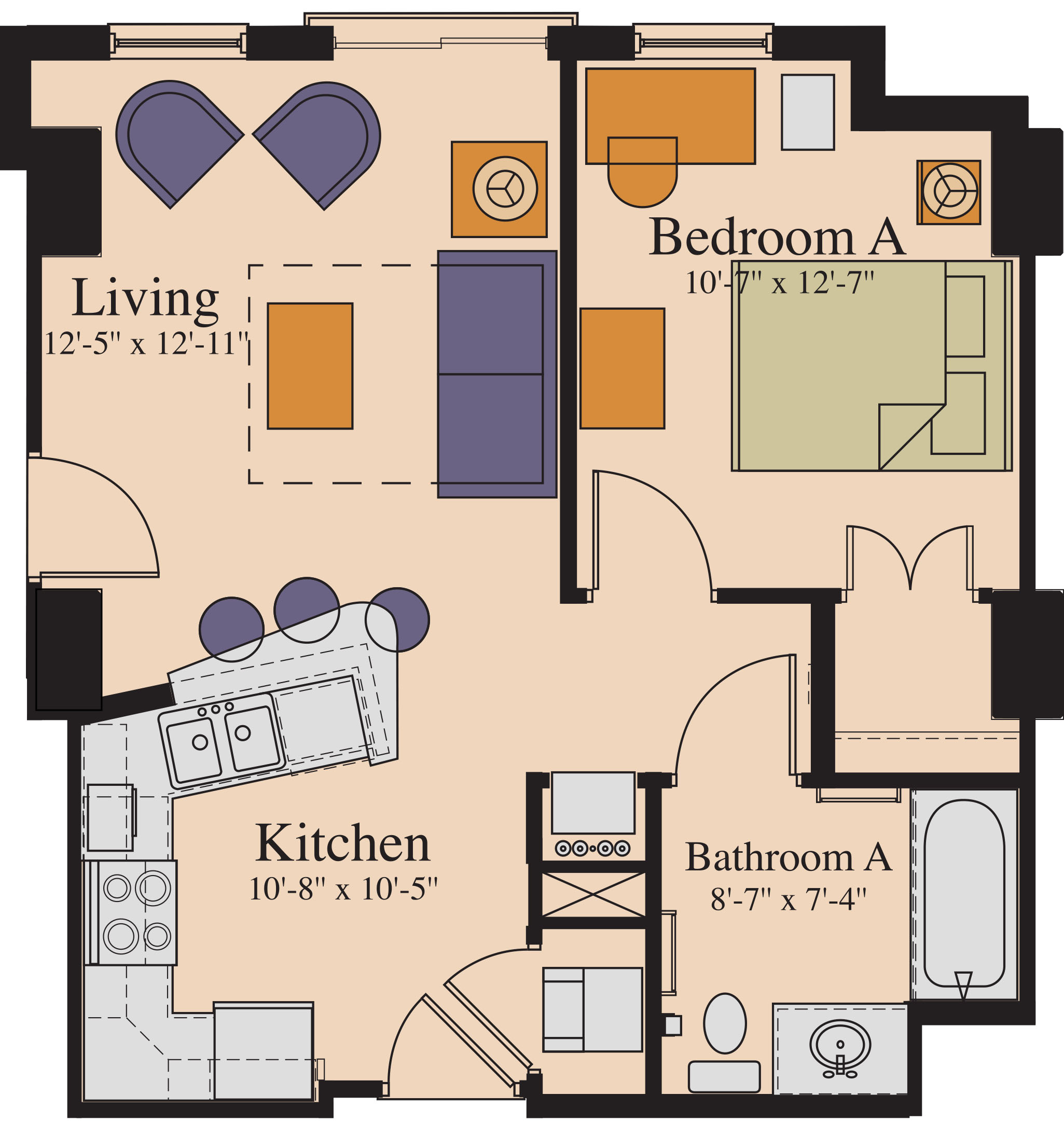 All bedrooms are single occupancy and are designed and furnished with queen bedding furniture to fit up to 2 people. Layouts offered are Efficiencies and 1 Bedroom Apartments. Efficiencies are hotel-like rooms with a kitchenette area, including a micro-fridge, microwave, and coffee maker, and a bathroom (in-unit). 1 Bedroom Apartments have a dedicated bedroom, living room, full kitchen, and bathroom (all in-unit).