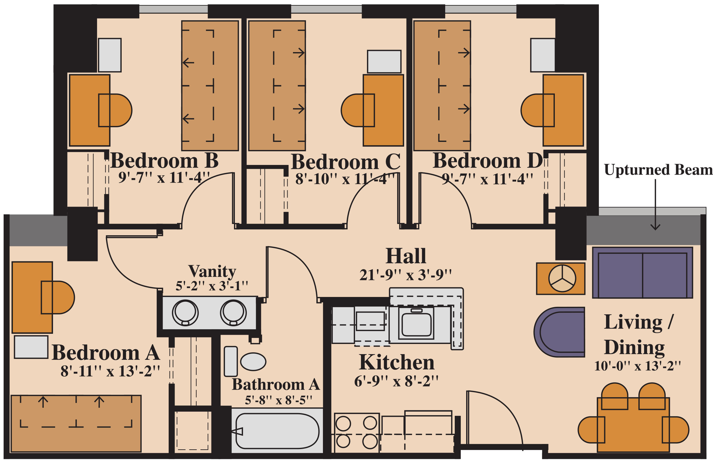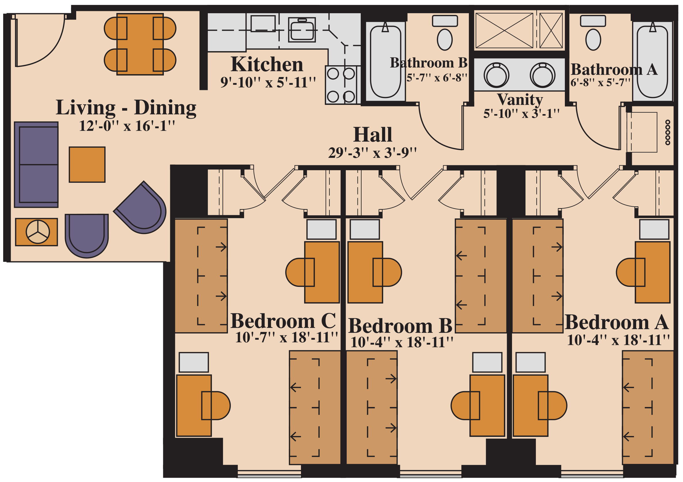 Single occupancy apartments in Campus Village Building B include a shared living area, a full kitchen with a stove, oven and full size refrigerator and 1-2 bathrooms depending on the number of occupants in the unit. Room configurations vary depending on the location within the building. Single occupancy rooms have one twin extra long bed. These apartments are limited.